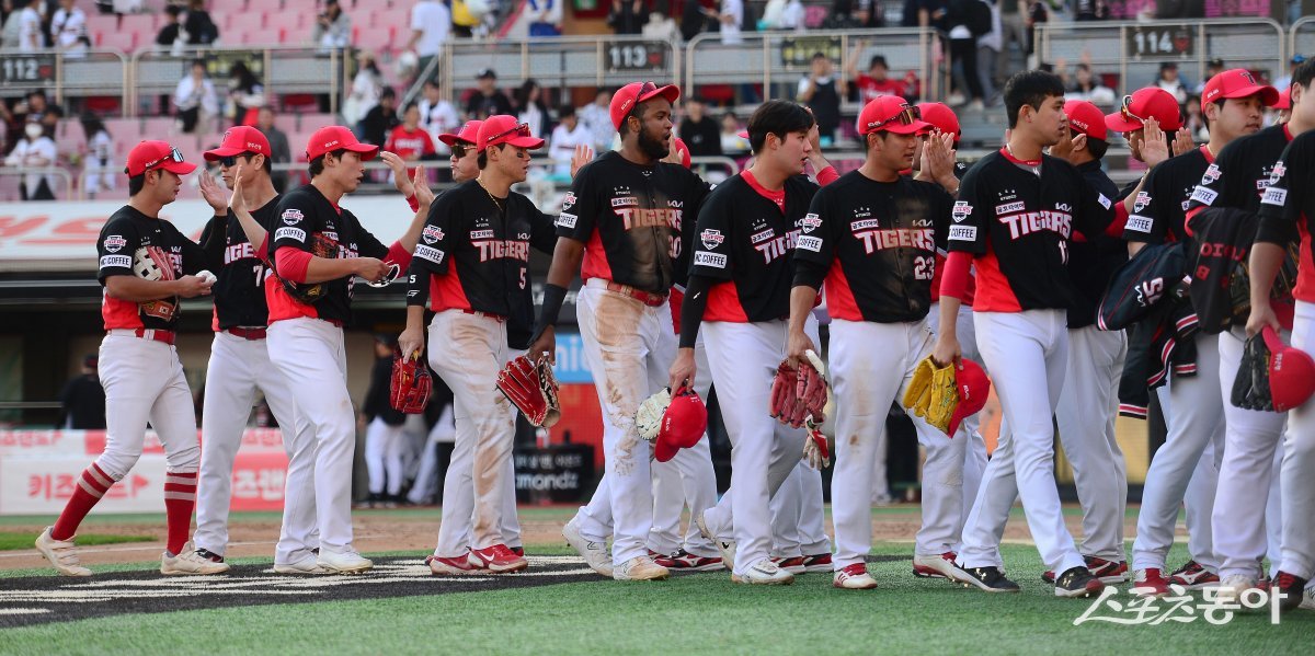 3일 수원 KT위즈파크에서 ‘2023 신한은행 SOL KBO리그’ KIA 타이거즈와 KT 위즈 경기가 열렸다. 3-1 승리를 거두며 2연패에서 탈출한 KIA 선수들이 하이파이브 하고 있다.