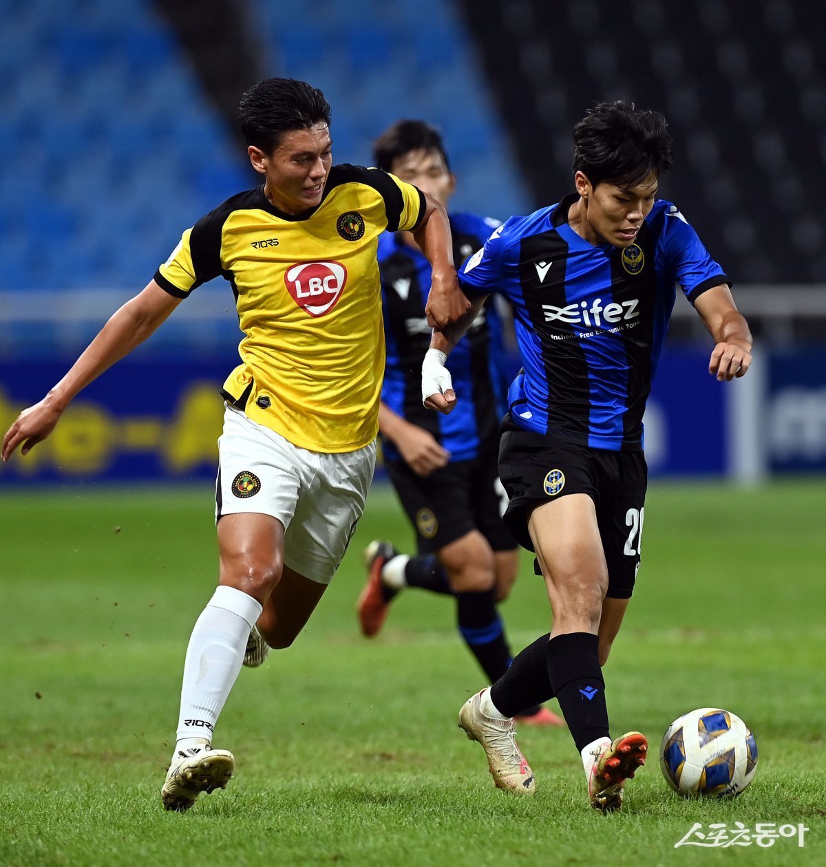 3일 인천축구전용경기장에서 열린 ‘아시아축구연맹(AFC) 챔피언스리그’ 인천 유나이티드와 카야 FC(필리핀)의 조별예선경기에서 인천 민경현이 카야 수비를 제치며 돌파하고 있다.