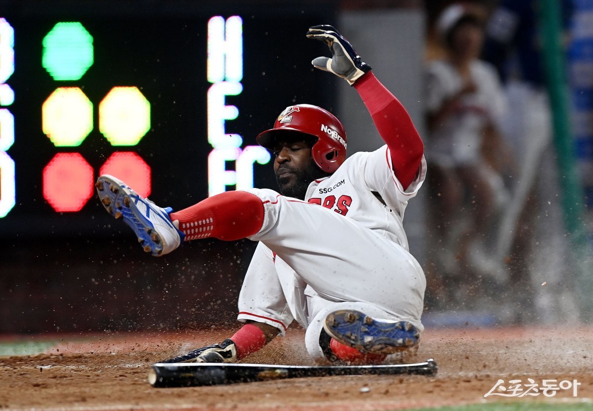 4일 인천 SSG 랜더스필드에서 ‘2023 신한은행 SOL KBO리그’ SSG 랜더스와 NC 다이노스의 경기가 열렸다. 4회말 2사 2루에서 안타 때 SSG 2루 주자 에레디아가 역전 득점을 올리고 있다.
