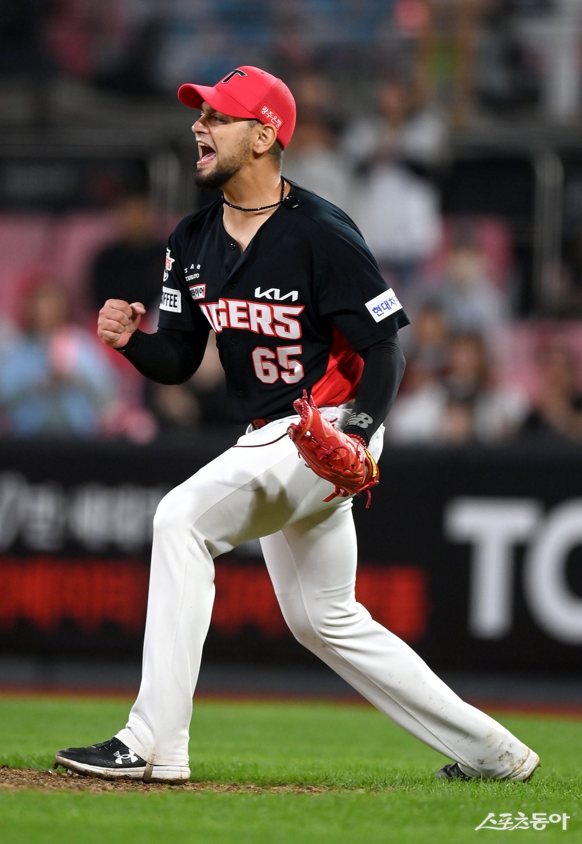 4일 수원 KT위즈파크에서 ‘2023 신한은행 SOL KBO리그’ KIA 타이거즈와 KT 위즈의 더블헤더 2차전 경기가 열렸다. 선발 투수로 등판한 KIA 산체스가 8회말 1사 1,2루 상황에서 병살로 이닝을 종효시킨 후 포효하고 있다.