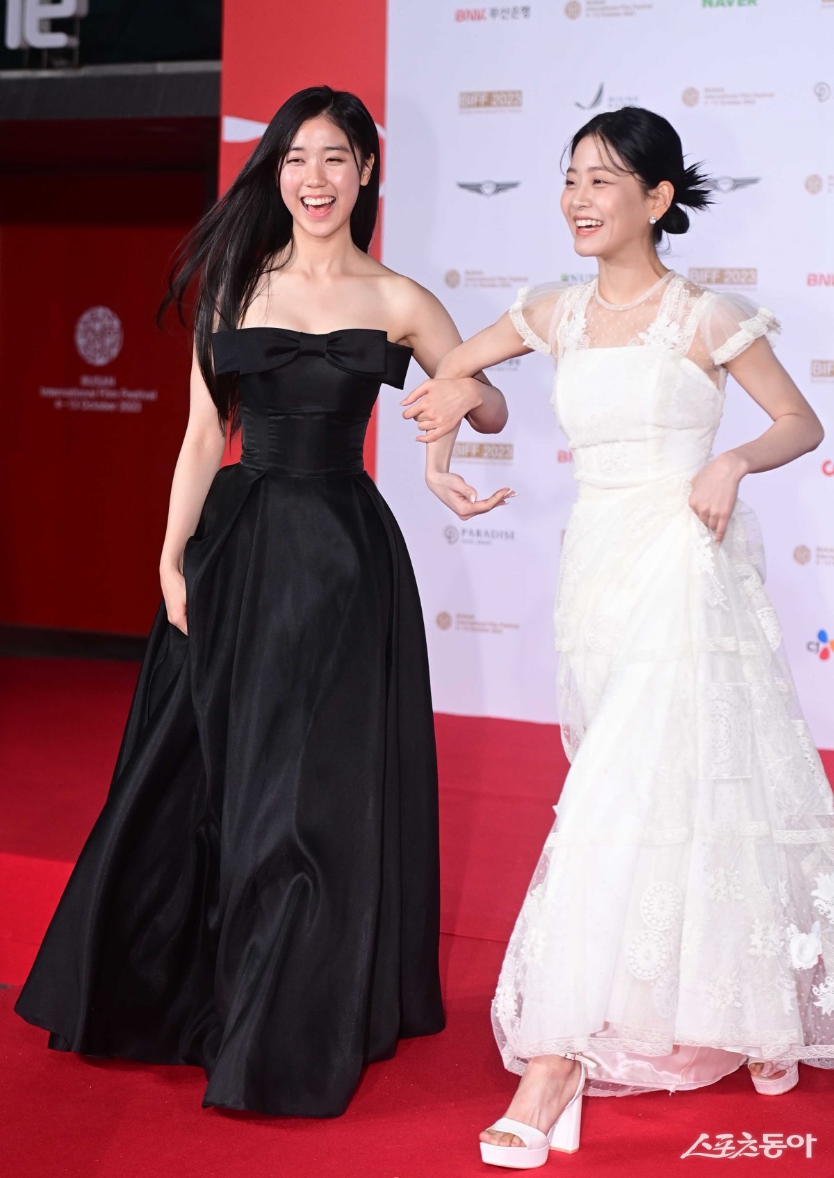 배우 이레, 정수빈이 4일 부산 해운대구 우동 영화의전당에서 열린 ‘제28회 부산국제영화제’ 레드카펫 행사에 입장하고 있다.