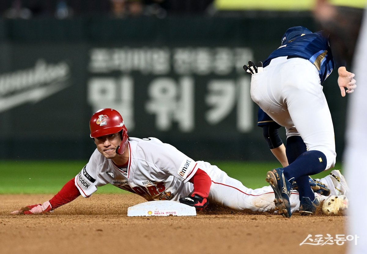 5일 인천 SSG 랜더스필드에서 ‘2023 신한은행 SOL KBO리그’ SSG 랜더스와 NC 다이노스의 경기가 열렸다. 3회말 무사 1루에서 SSG 오태곤이 2루 도루를 성공시키고 있다.