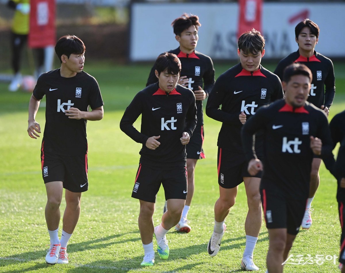 한국축구대표팀이 9일 경기도 파주 축구대표팀트레이닝센터(NFC)에서 친선경기에 앞서 소집훈련을 진행했다. 한국 홍현석, 이강인, 오현규가 러닝을 하고 있다.