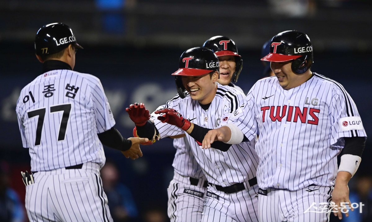 10일 서울 잠실야구장에서 열린 ‘2023 신한은행 SOL KBO리그’ LG 트윈스와 롯데 자이언츠의 경기에서 5회말 무사 1, 2루 LG 박해민이 우월 3점 홈런을 친 후 동료와 기쁨을 나누고 있다.