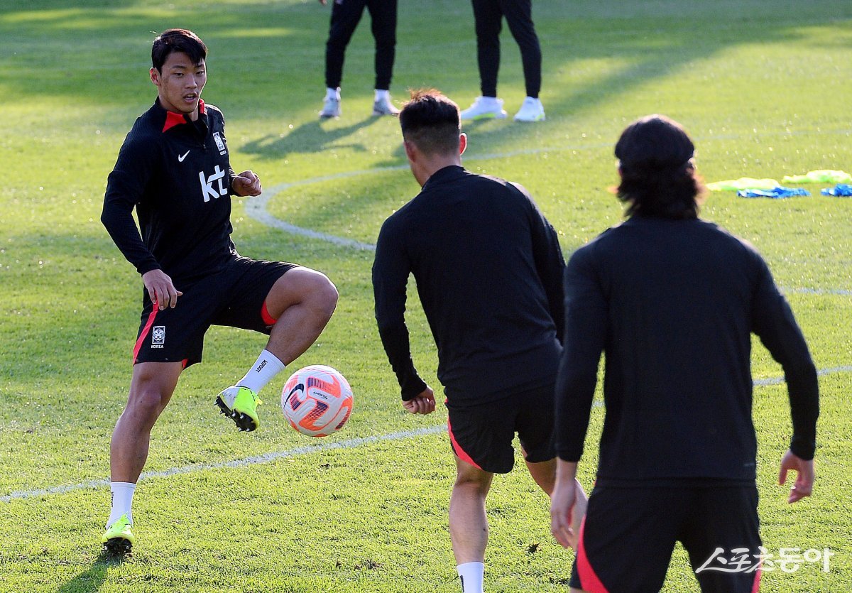 한국축구국가대표팀이 10월 A매치 튀니지와 평가전을 앞두고 12일 경기도 파주 축구국가대표트레이닝센터(NFC)에서 공식 기자회견 및 훈련을 가졌다. 축구대표팀 황희찬이 동료들과 볼 빼앗기 훈련을 하고 있다.