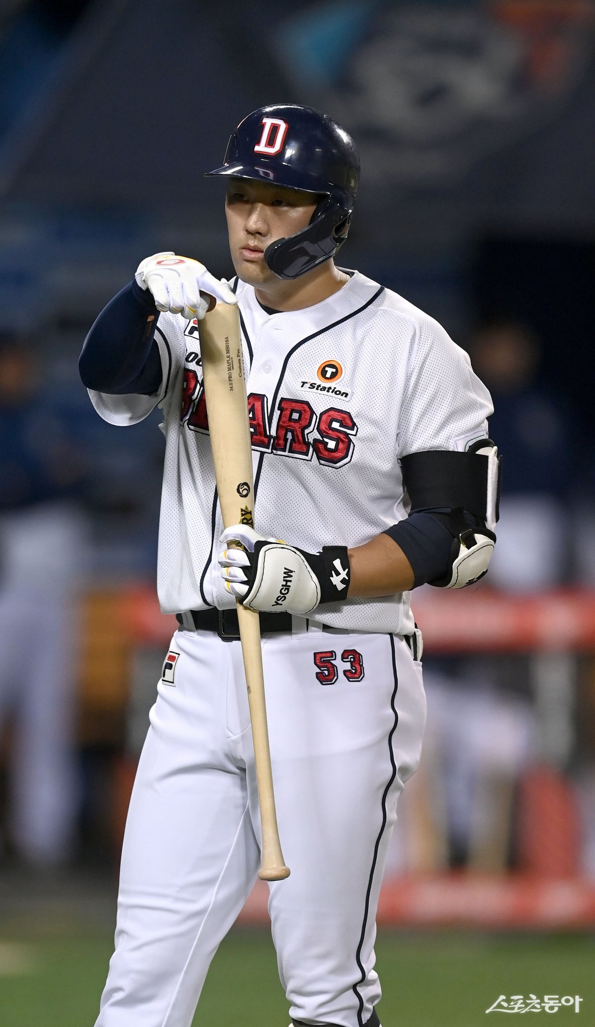 12일 서울 잠실야구장에서 ‘2023 신한은행 SOL KBO리그’ NC 다이노스와 두산 베어스 경기가 열렸다. 1회말 1사 두산 양석환이 파울 홈런을 날린 후 비디오판독을 기다리며 이야기하고 있다.