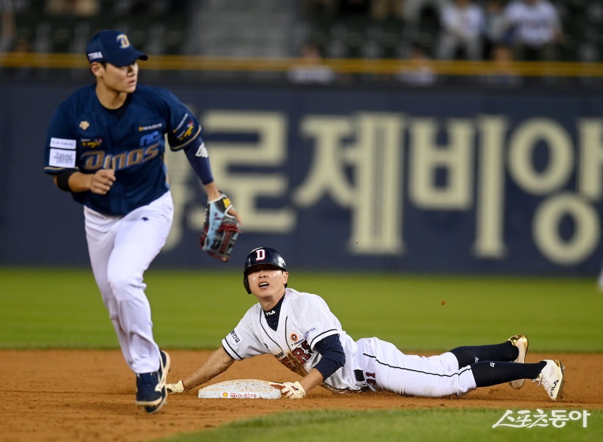 12일 서울 잠실야구장에서 ‘2023 신한은행 SOL KBO리그’ NC 다이노스와 두산 베어스 경기가 열렸다. 4회말 1사 1루 상황에서 두산 1루주자 정수빈이 2루 도루에 성공하고 있다.