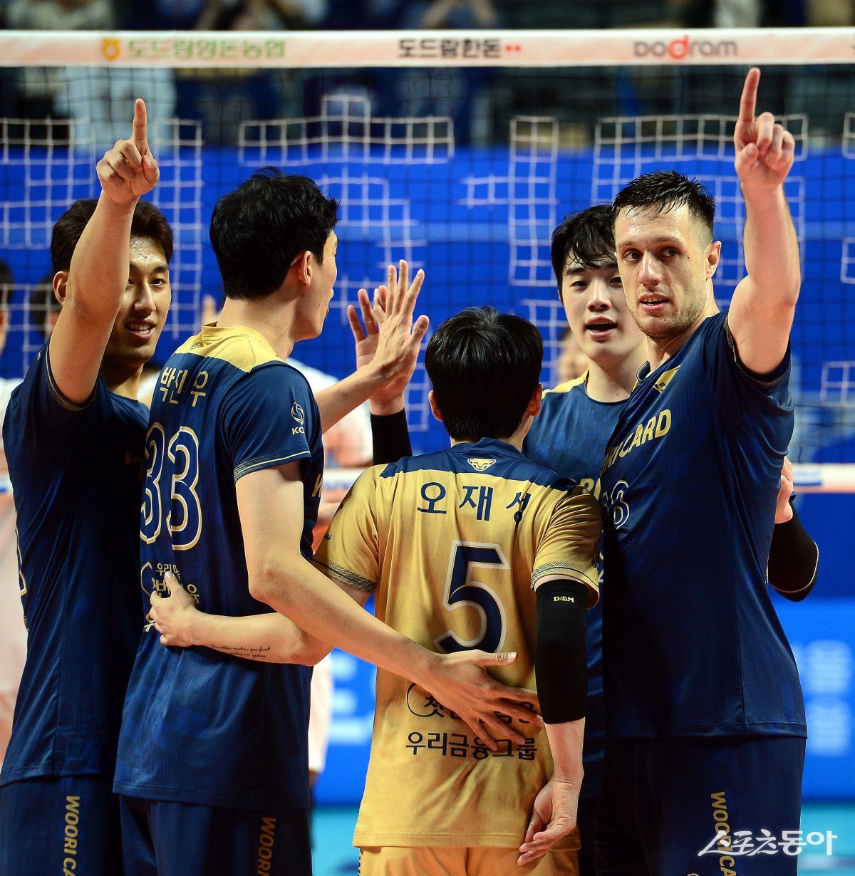 15일 서울 중구 장충체육관에서 ‘2023-2024 도드람 V리그’ 서울 우리카드와 대전 삼성화재의 남자부 경기가 열렸다. 우리카드 마테이가 승리를 앞두고 환호하고 있다.