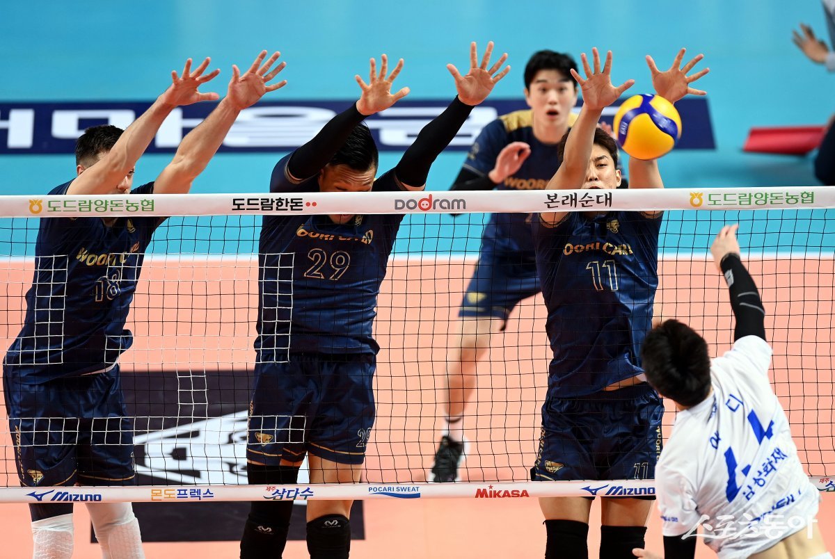 15일 서울 중구 장충체육관에서 ‘2023-2024 도드람 V리그’ 서울 우리카드와 대전 삼성화재의 남자부 경기가 열렸다. 우리카드 선수들이 삼성화재 공격을 막아내고 있다.
