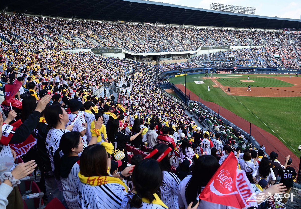 15일 서울 잠실야구장에서 열린 ‘2023 신한은행 SOL KBO리그’ LG 트윈스와 두산 베어스의 경기에서 만원 관중들이 응원을 펼치고 있다. 어제까지 798만 명이 입장했던 프로야구는 누적 관중 800만 명을 돌파했다.