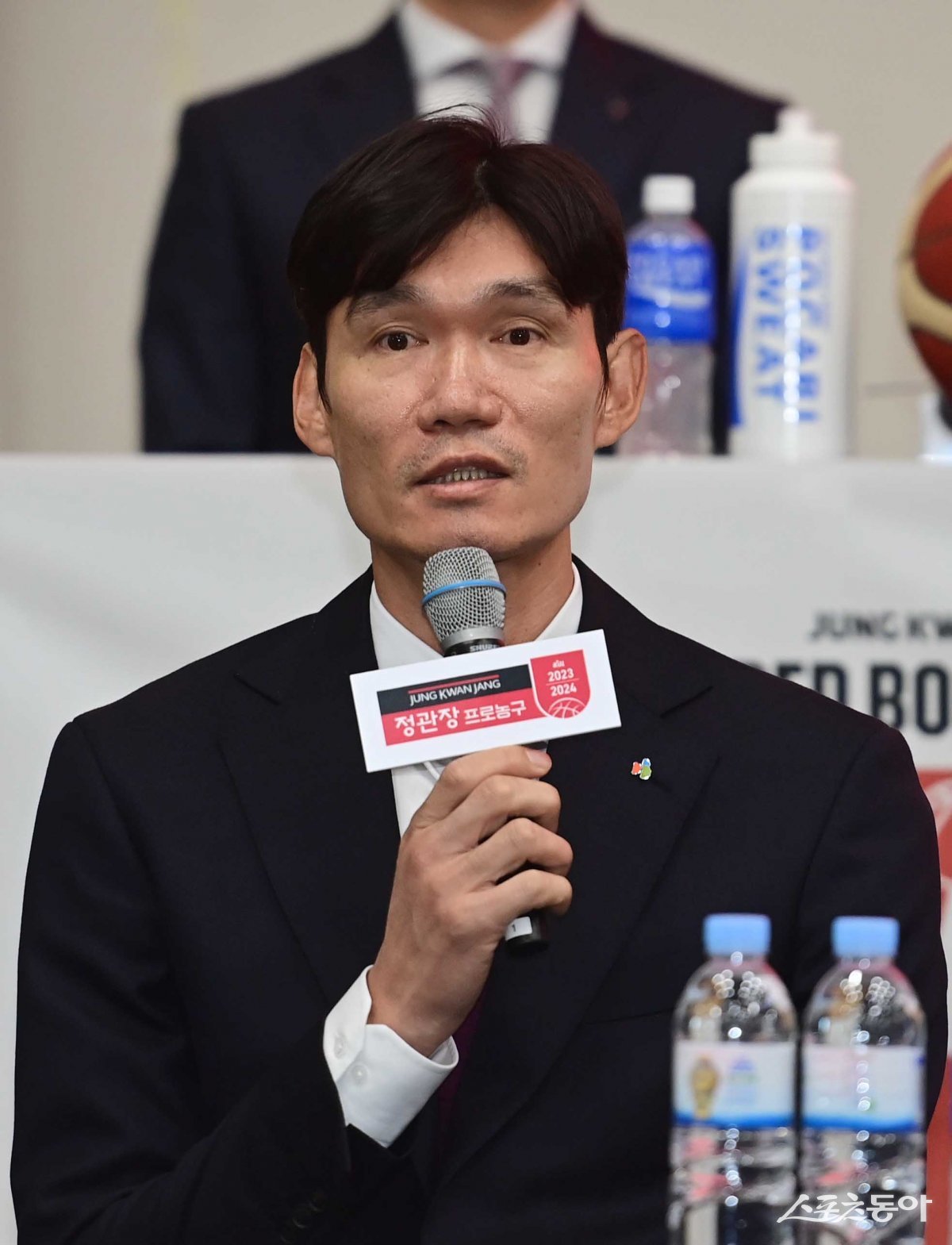 16일 서울 송파구 방이동 올림픽파크텔에서 열린 ‘2023-2024 정관장 프로농구’ 개막 미디어데이에서 원주 DB 김주성 감독이 출사표를 말하고 있다.