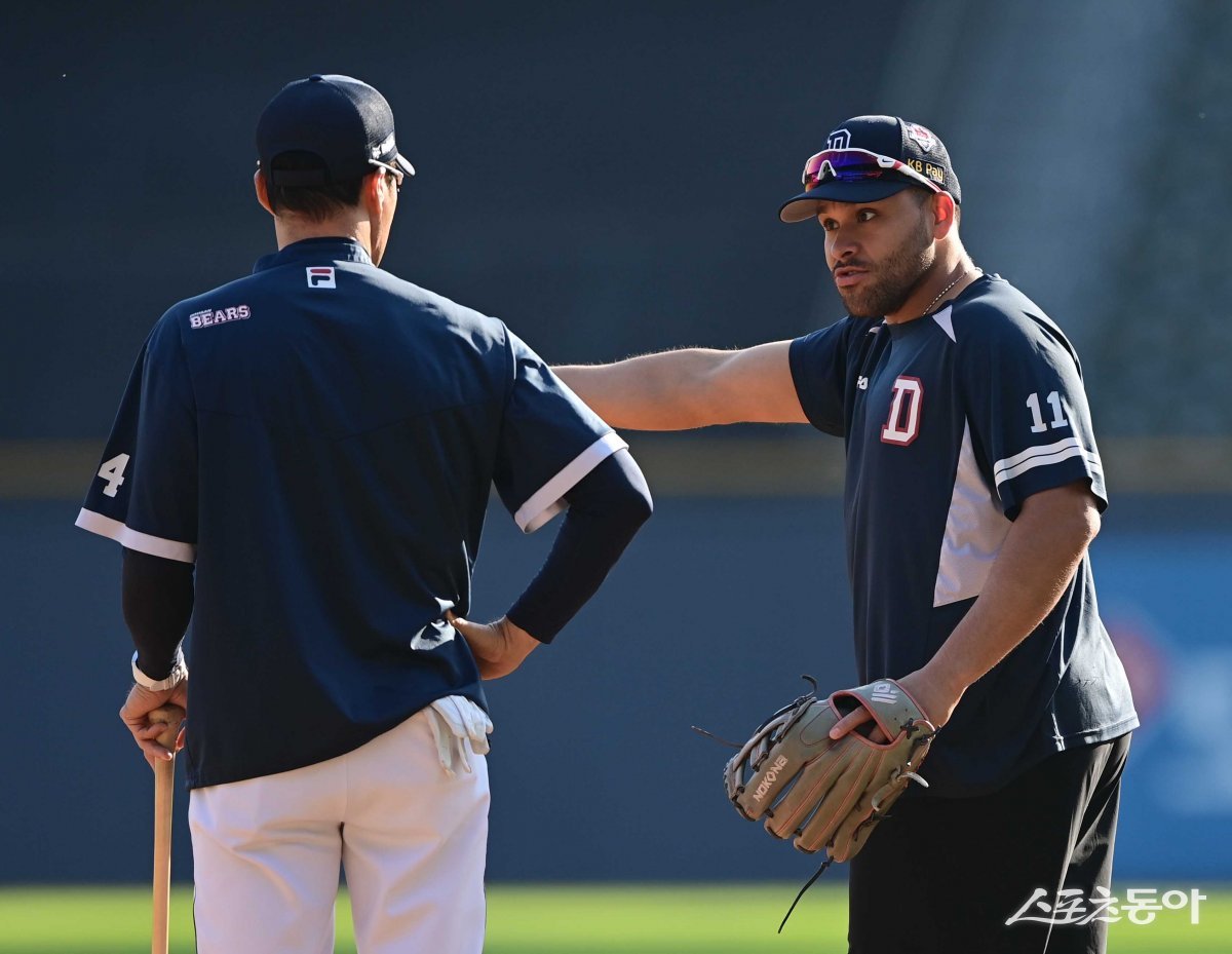 16일 서울 잠실야구장에서 열린 ‘2023 신한은행 SOL KBO리그’ 두산 베어스와 SSG 랜더스의 경기에 앞서 두산 로하스가 코치와 이야기를 하고 있다.
