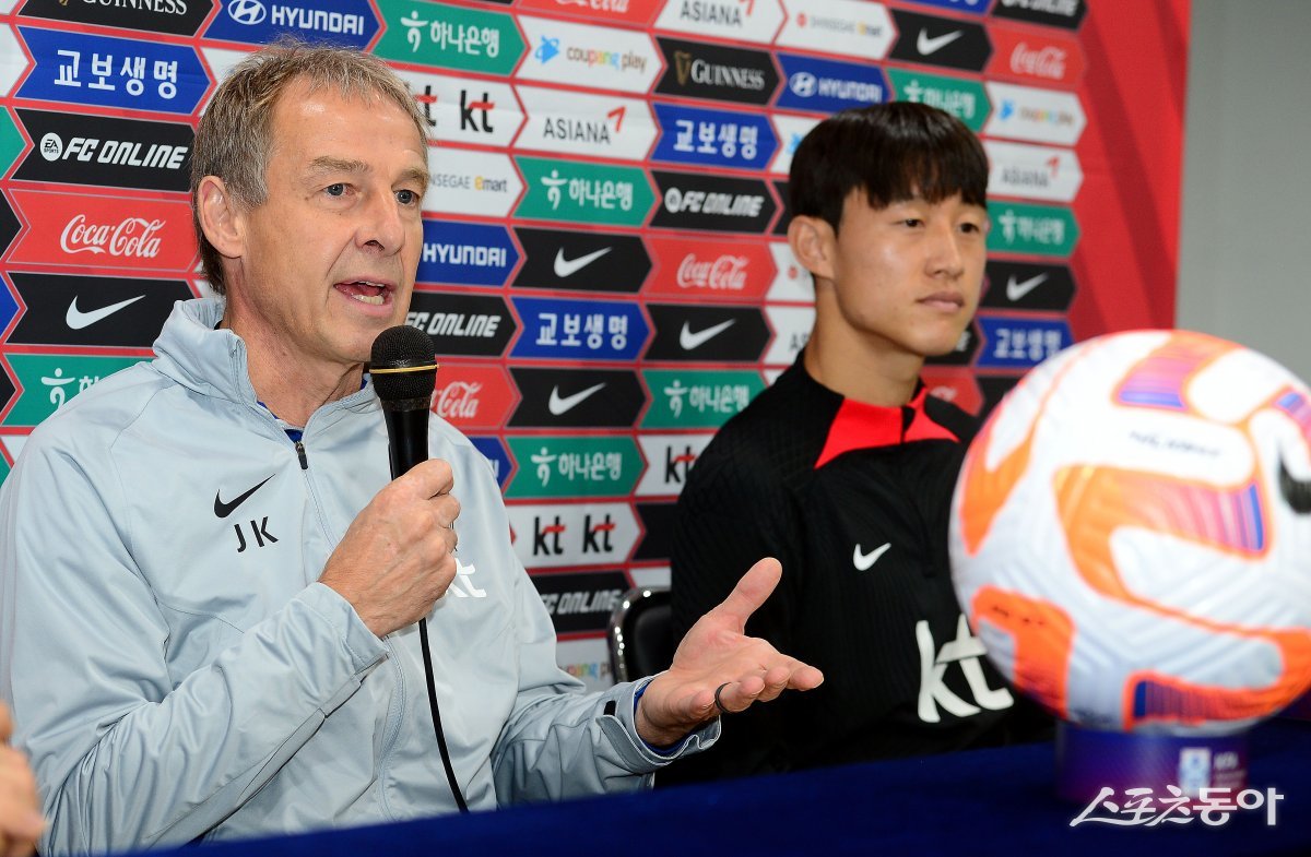 한국축구국가대표팀이 베트남과 10월 A매치 평가전을 앞두고 16일 경기도 수원월드컵경기장에서 기자회견을 가졌다. 축구대표팀 클린스만 감독이 인터뷰를 하고 있다.
