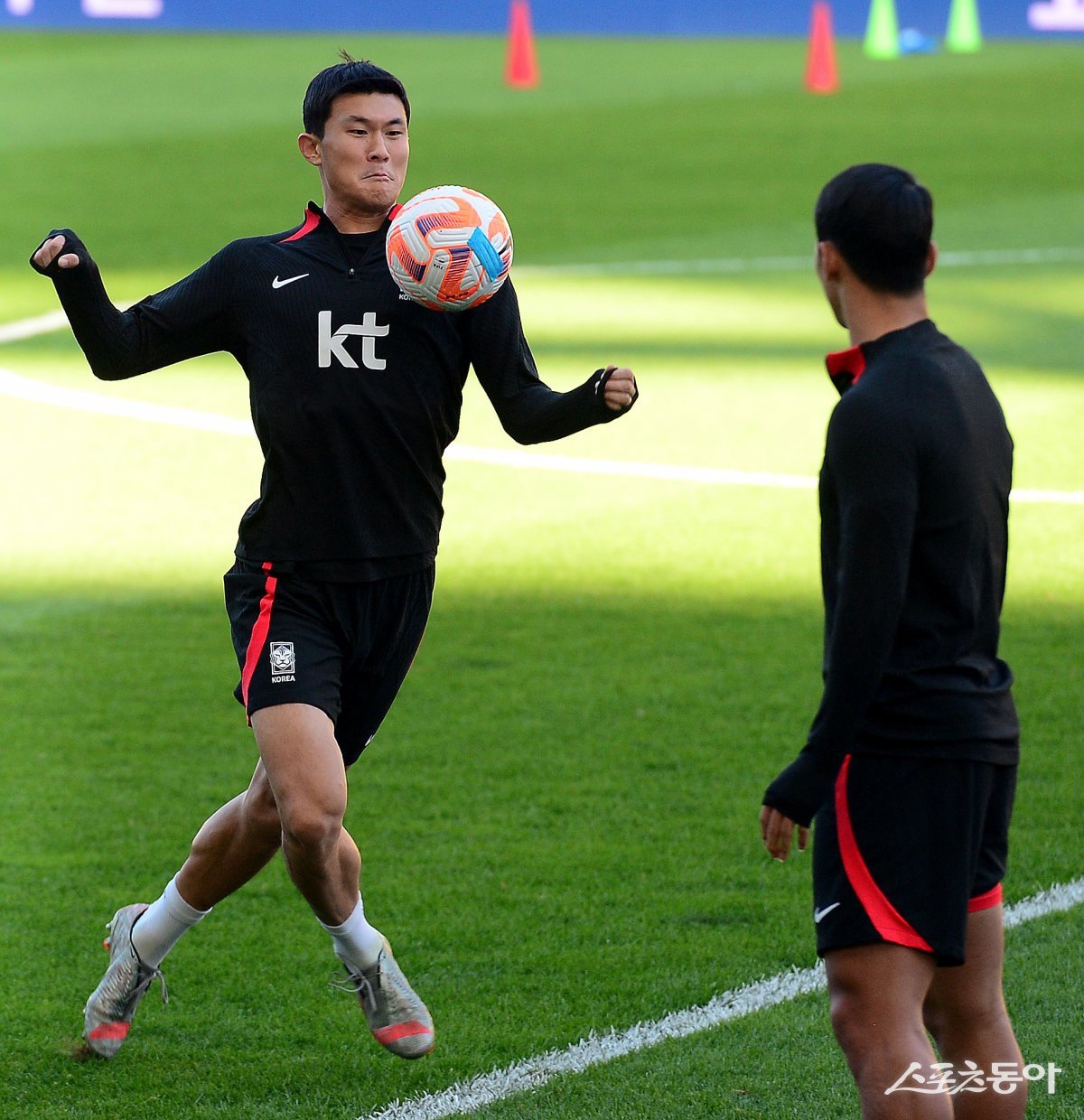 한국축구국가대표팀이 베트남과 10월 A매치 평가전을 앞두고 16일 경기도 수원월드컵경기장에서 훈련을 가졌다. 축구대표팀 김민재가 패스 게임을 하고 있다.