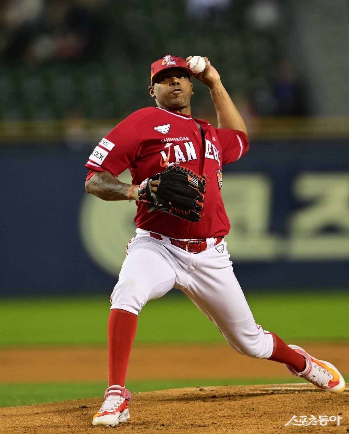 16일 서울 잠실야구장에서 열린 ‘2023 신한은행 SOL KBO리그’ 두산 베어스와 SSG 랜더스의 경기에서 선발 투수로 마운드에 오른 SSG 엘리아스가 역투하고 있다.