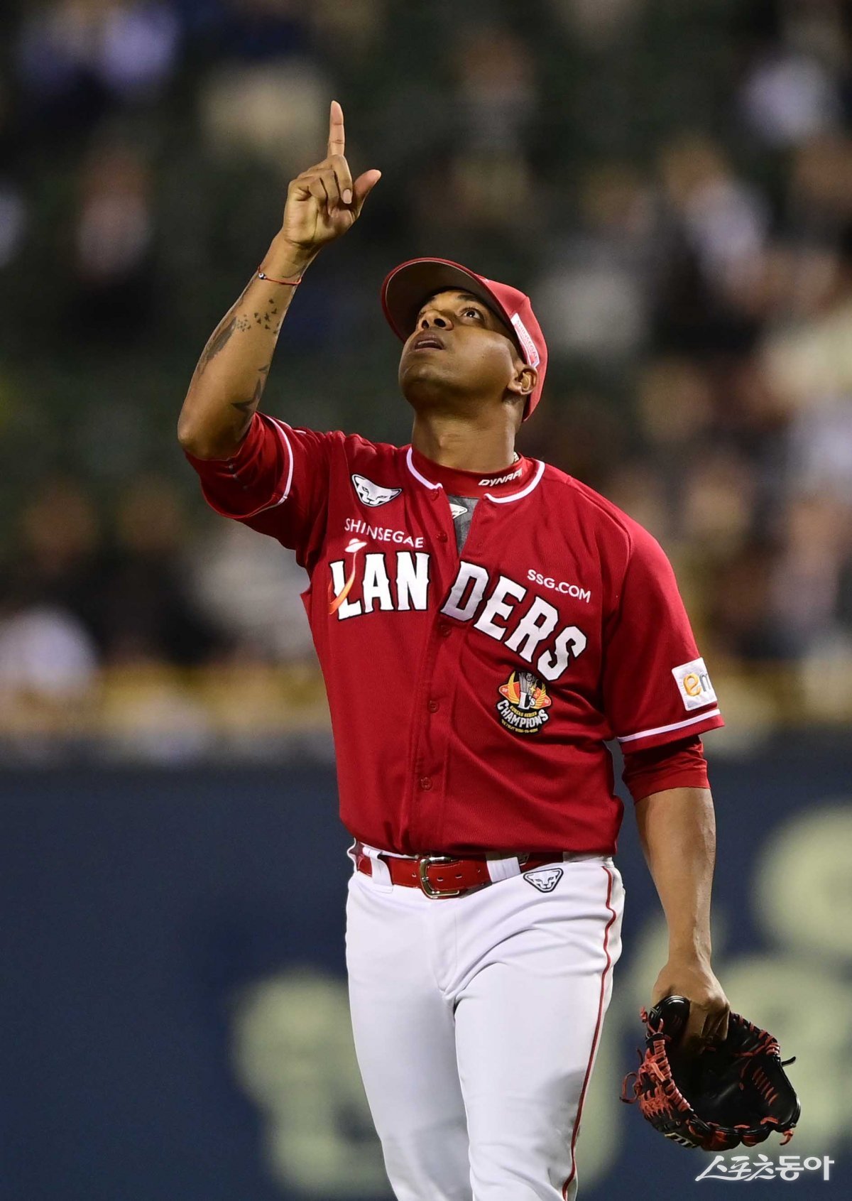 16일 서울 잠실야구장에서 열린 ‘2023 신한은행 SOL KBO리그’ 두산 베어스와 SSG 랜더스의 경기에서 1회말 무실점으로 수비를 마친 SSG 엘리아스가 세리머니를 하고 있다.