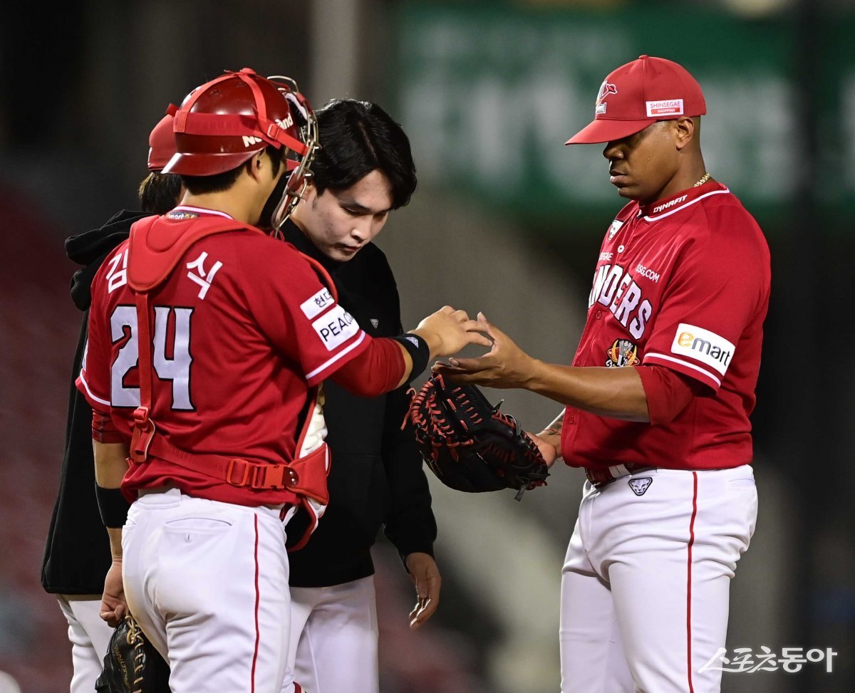 16일 서울 잠실야구장에서 열린 ‘2023 신한은행 SOL KBO리그’ 두산 베어스와 SSG 랜더스의 경기에서 5회말 2사 1루 두산에 1점을 허용한 SSG 엘리아스가 포수와 이야기를 하고 있다.