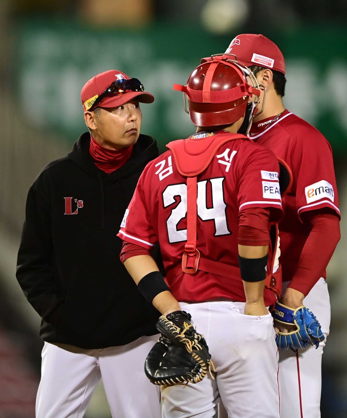 16일 서울 잠실야구장에서 열린 ‘2023 신한은행 SOL KBO리그’ 두산 베어스와 SSG 랜더스의 경기에서 9회말 2사 1루 SSG 김원형 감독이 선수들을 격려하고 있다.