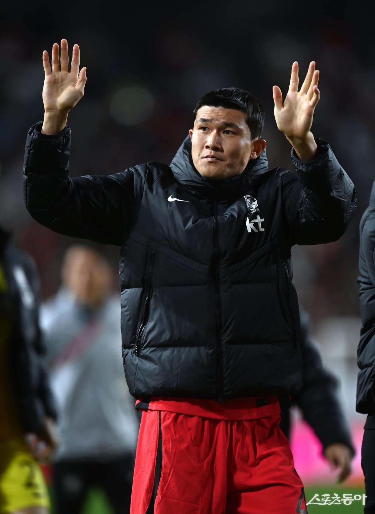 대한민국 축구대표팀이 17일 수원월드컵경기장에서 베트남과 평가전을 가졌다. 6-0 승리를 거둔 후 김민재가 팬들에게 인사하고 있다.