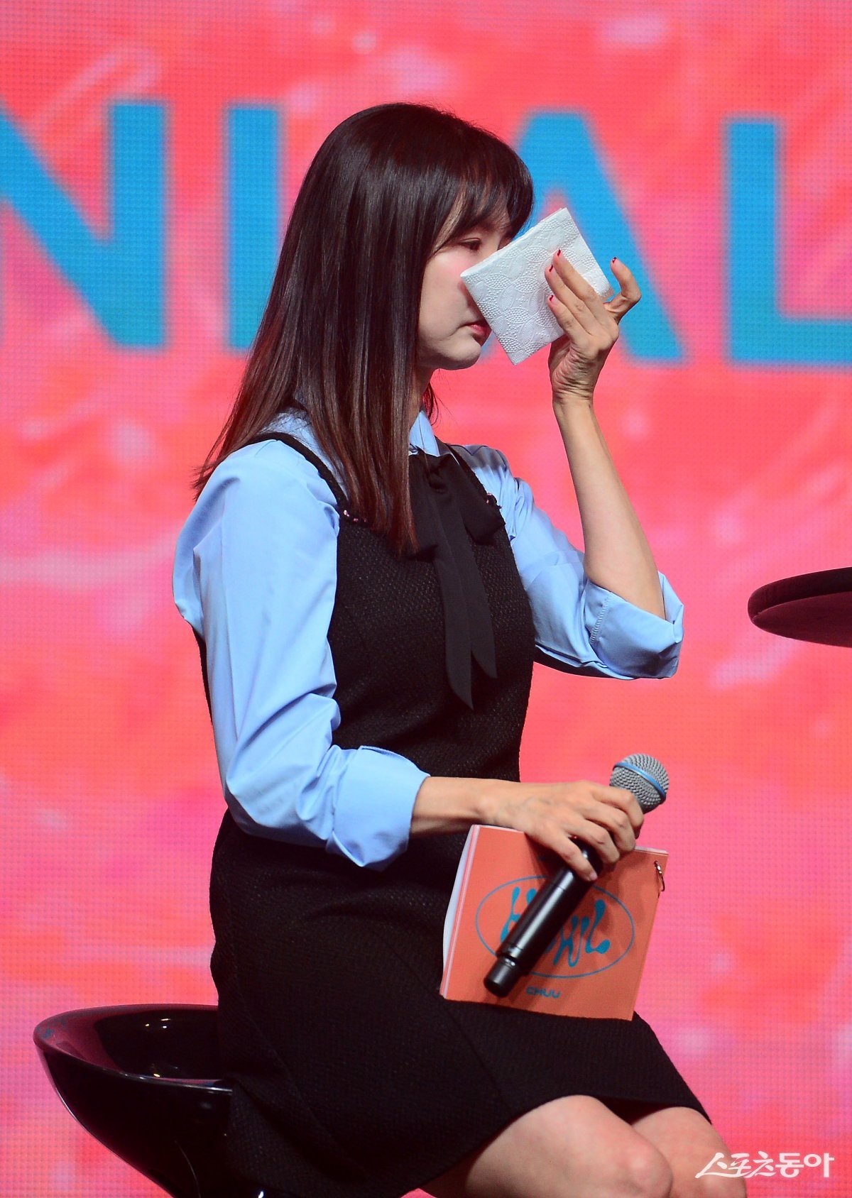 가수 츄(CHUU)가 18일 서울 광진구 예스24 라이브홀에서 첫 번째 미니 앨범 ‘Howl’ 발매 쇼케이스에서 전 소속사와의 갈등에 대해 대답하며 눈물을 흘리자 사회자 박소현이 눈믈을 닦고 있다.