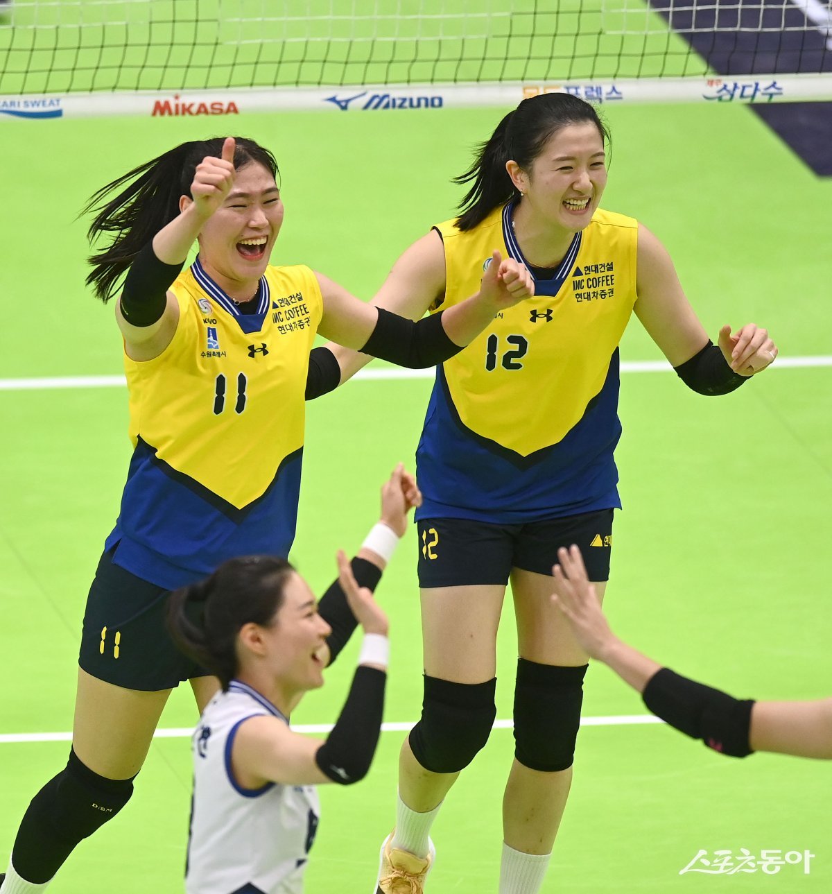 18일 수원체육관에서 열린 ‘도드람 2023~2024 V리그’ 여자부 현대건설과 흥국생명 경기에서 현대건설 김주향이 득점에 성공한 후 이다현과 기뻐하고 있다.
