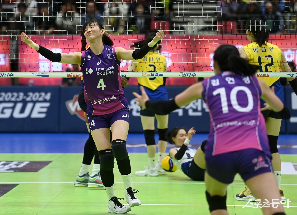 18일 수원체육관에서 열린 ‘도드람 2023~2024 V리그’ 여자부 현대건설과 흥국생명 경기에서 흥국생명 이주아가 5세트 결정적인 블로킹 득점에 성공한 후 기뻐하고 있다.