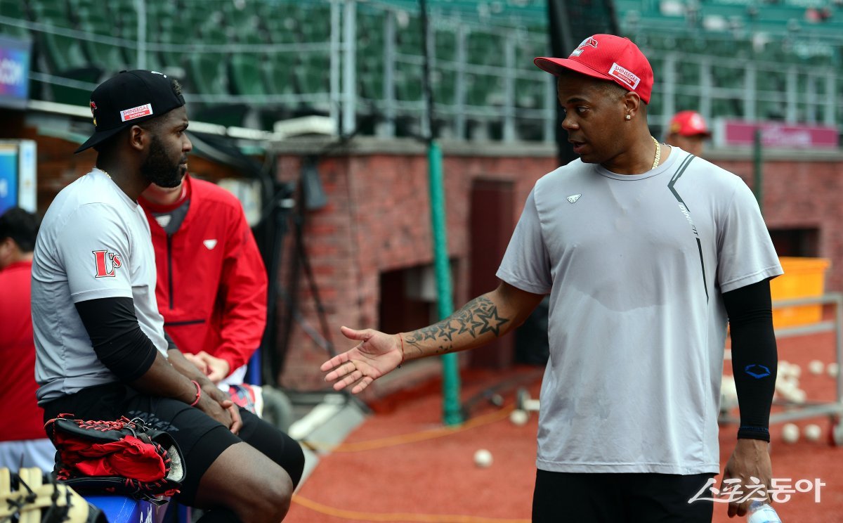 19일 인천 SSG 랜더스필드에서 SSG 랜더스가 준플레이오프를 앞두고 훈련을 가졌다. SSG 에레디아와 엘리아스가 이야기를 나누고 있다.