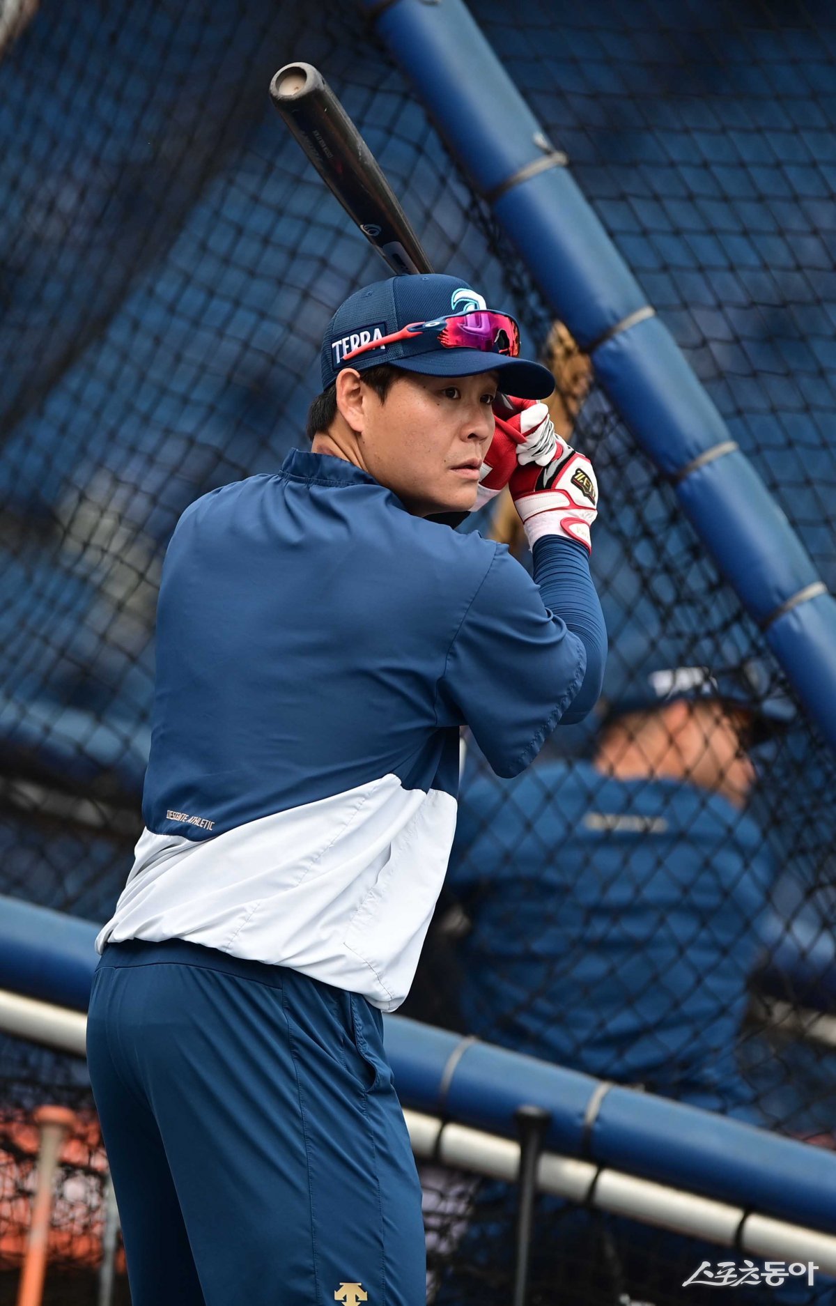 19일 창원NC파크에서 열린 ‘2023 KBO 포스트시즌’ NC 다이노스와 두산 베어스의 와일드카드 1차전 경기에 앞서 NC 박세혁이 타격 자세를 잡고 있다.