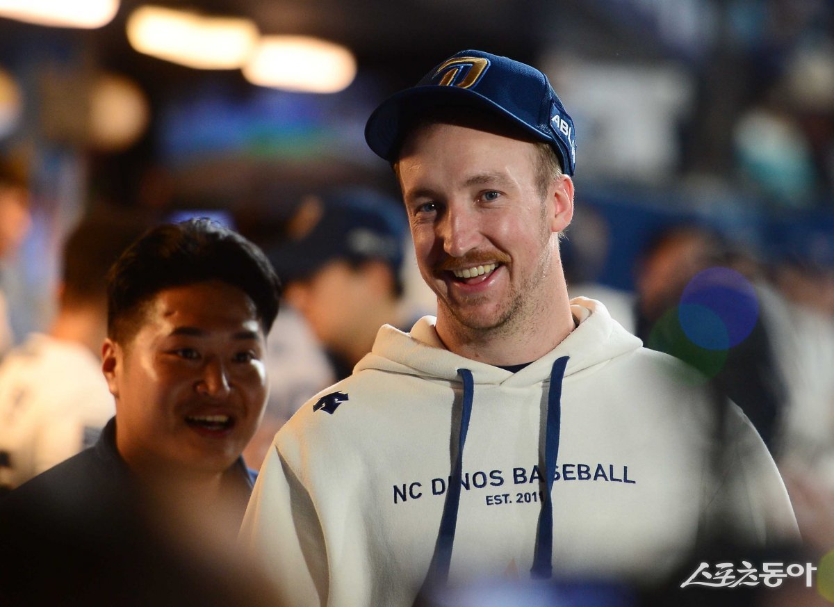 19일 창원NC파크에서 열린 ‘2023 KBO 포스트시즌’ NC 다이노스와 두산 베어스의 와일드카드 1차전 경기에서 4회말 2사 NC의 백투백 홈런에 페디가 더그아웃에서 기뻐하고 있다.