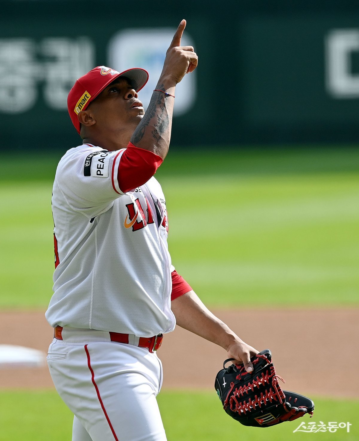 22일 인천 SSG 랜더스필드에서 ‘2023 신한은행 SOL KBO리그’ SSG 랜더스와 NC 다이노스의 준PO 1차전 경기가 열렸다. SSG 선발투수 엘리아스가 1회초 NC 공격을 삼자범퇴로 막은 후 세리머니를 펼치고 있다.