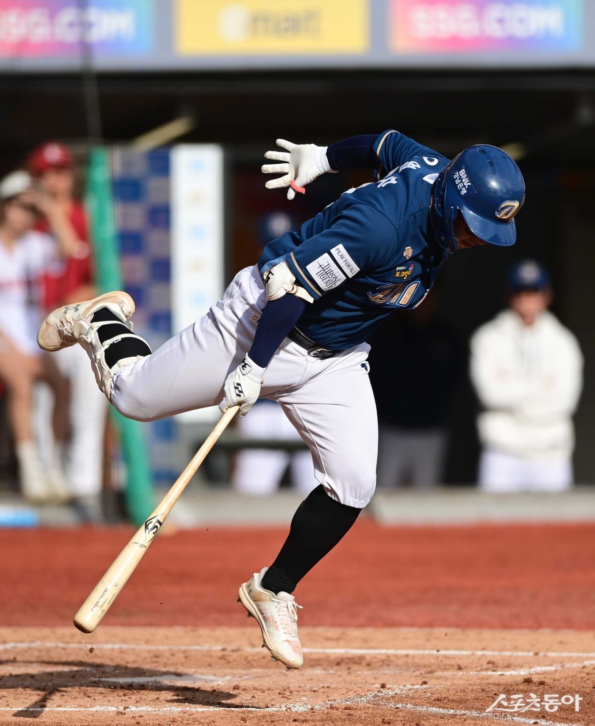 22일 인천 SSG랜더스필드에서 열린 ‘2023 KBO 포스트시즌’ SSG 랜더스와 NC 다이노스의 준플레이오프 1차전 경기에서 5회초 2사 NC 오영수가 자신의 타구에 맞으며 점프하고 있다.