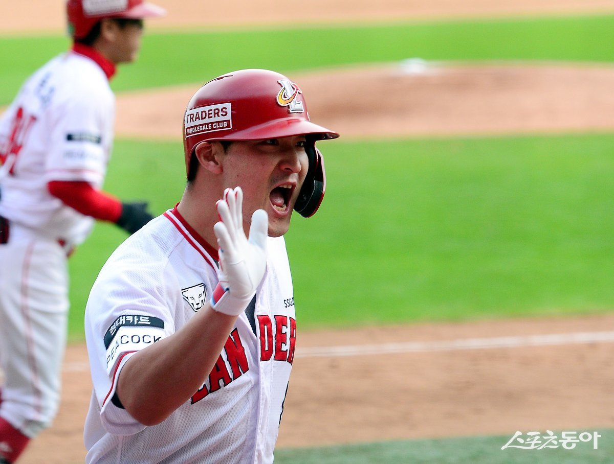 22일 인천 SSG 랜더스필드에서 ‘2023 신한은행 SOL KBO리그’ SSG 랜더스와 NC 다이노스의 준PO 1차전 경기가 열렸다. 9회말 무사 1루에서 SSG 하재훈이 투런 홈런을 쏘아 올린 후 환호하고 있다.