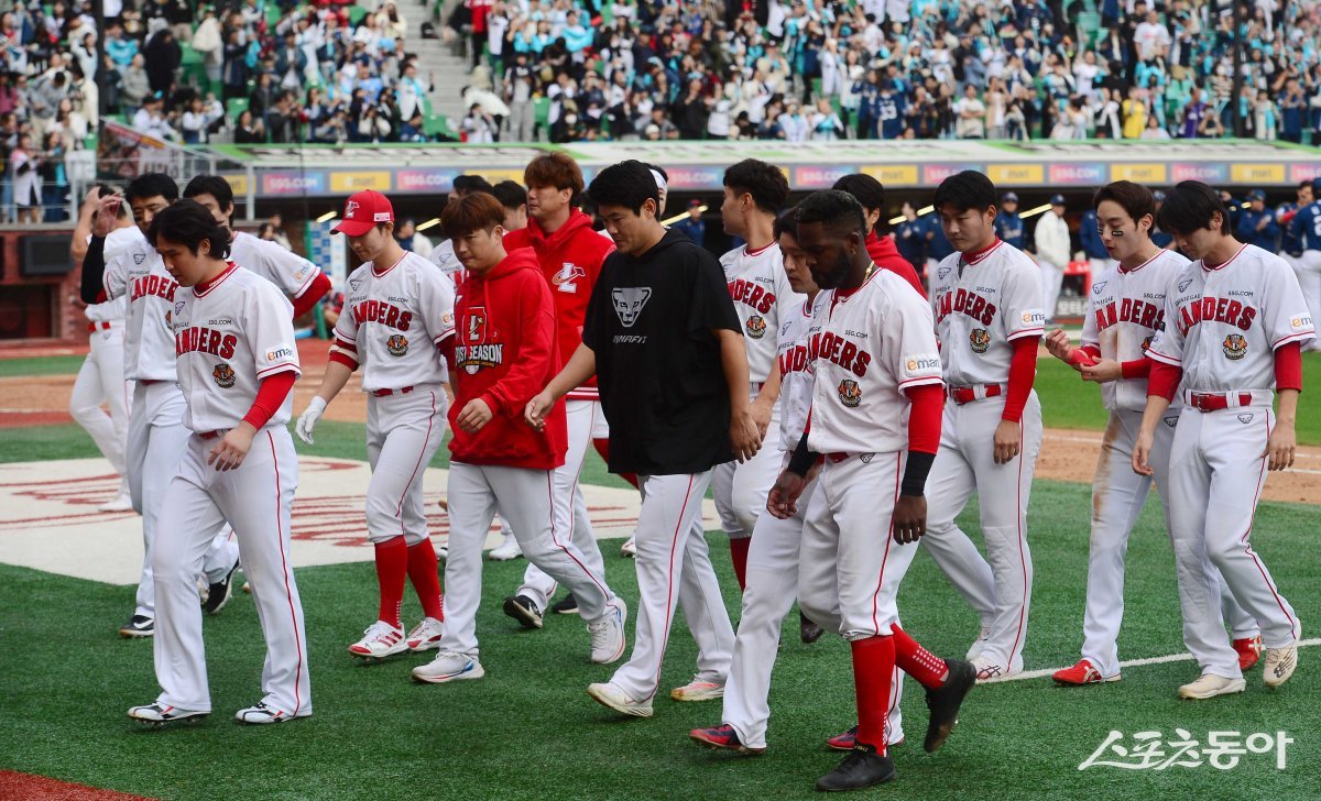 22일 인천 SSG랜더스필드에서 열린 ‘2023 KBO 포스트시즌’ SSG 랜더스와 NC 다이노스의 준플레이오프 1차전 경기에서 3-4로 패한 SSG 선수들이 고개를 숙인채 더그아웃으로 향하고 있다.