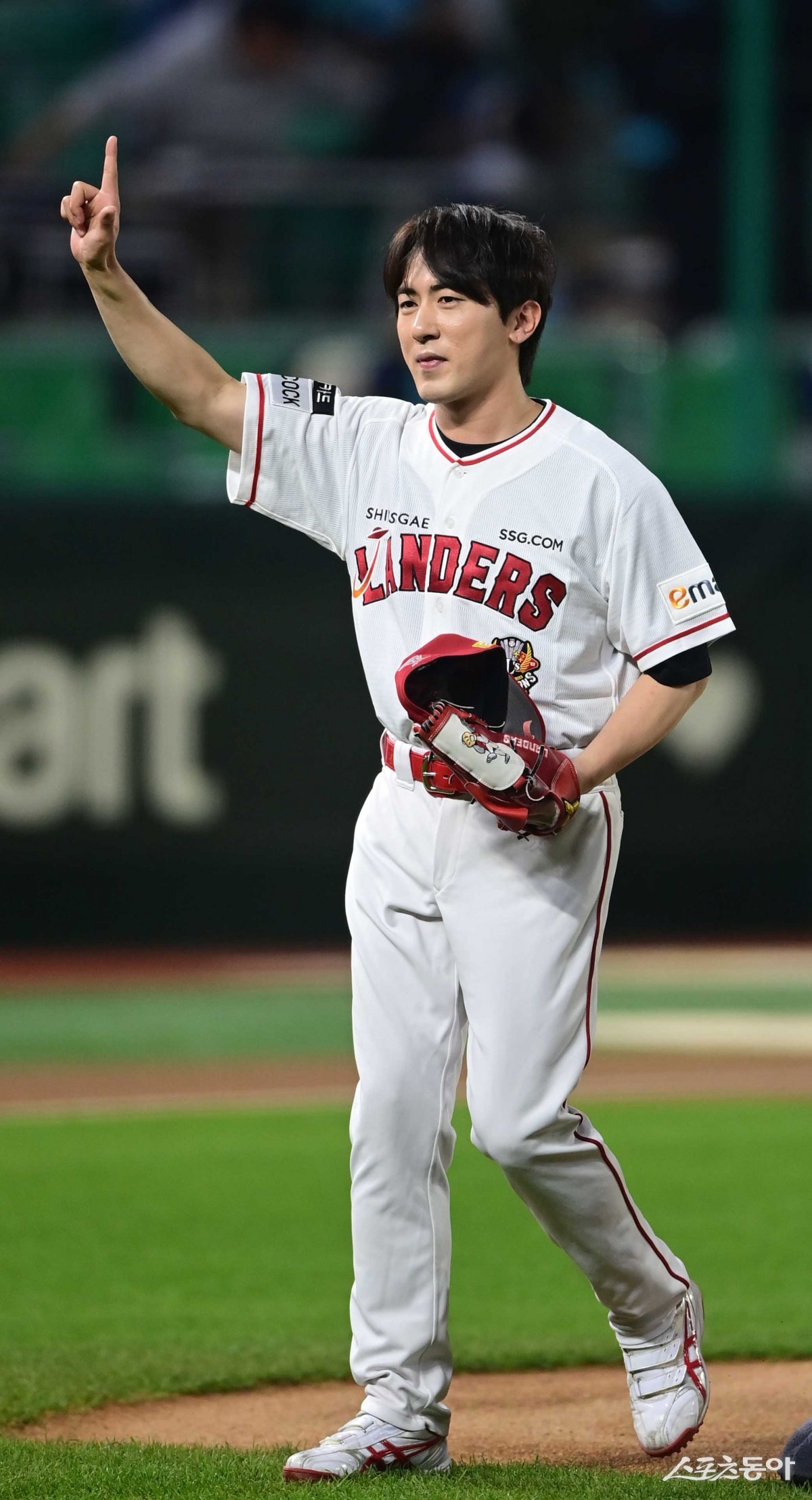 23일 인천 SSG랜더스필드에서 열린 ‘2023 KBO 포스트시즌’ SSG 랜더스와 NC 다이노스의 준플레이오프 2차전 경기에 앞서 개그맨 김원훈이 시구를 마친 후 포즈를 취하고 있다.