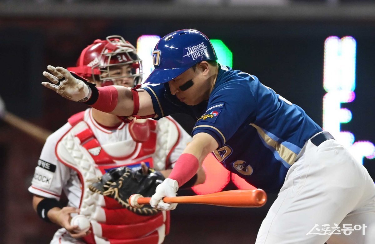 23일 인천 SSG랜더스필드에서 열린 ‘2023 KBO 포스트시즌’ SSG 랜더스와 NC 다이노스의 준플레이오프 2차전 경기에서 2회초 2사 NC 손아섭이 헛스윙을 하며 중심을 잃고 있다.