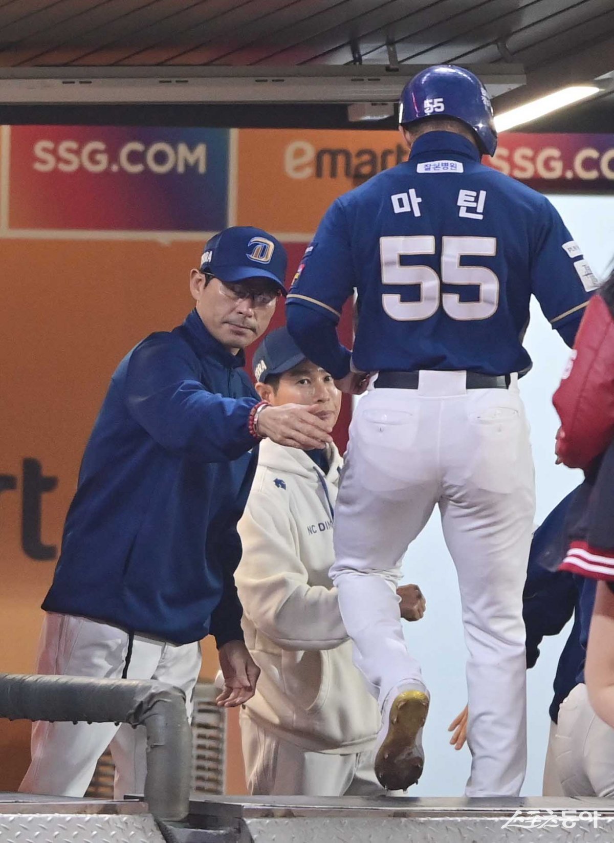 23일 인천 SSG랜더스필드에서 열린 ‘2023 KBO 포스트시즌’ SSG 랜더스와 NC 다이노스의 준플레이오프 2차전 경기에서 1회초 1사 1, 3루 NC 희생타 때 득점에 성공한 3루주자 마틴이 강인권 감독에 축하를 받고 있다.