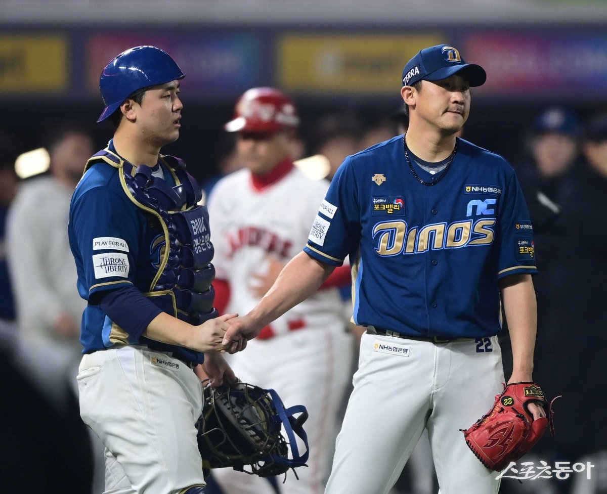 23일 인천 SSG랜더스필드에서 열린 ‘2023 KBO 포스트시즌’ SSG 랜더스와 NC 다이노스의 준플레이오프 2차전 경기에서 7-3으로 승리한 NC 이용찬과 김형준이 기쁨을 나누고 있다.