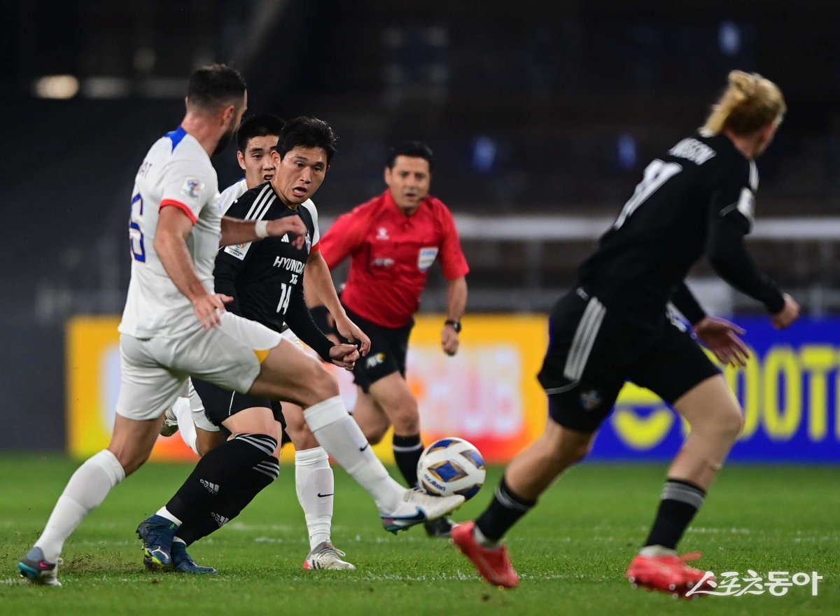 24일 울산문수축구경기장에서 열린 ‘2023-2024 아시아축구연맹(AFC) 챔피언스리그(ACL)’ 조별 리가 I조 3차전 울산 현대와 조호르 다룰 탁짐(말레이시아)과 경기에서 울산 이동경이 동료를 향해 패스하고 있다.