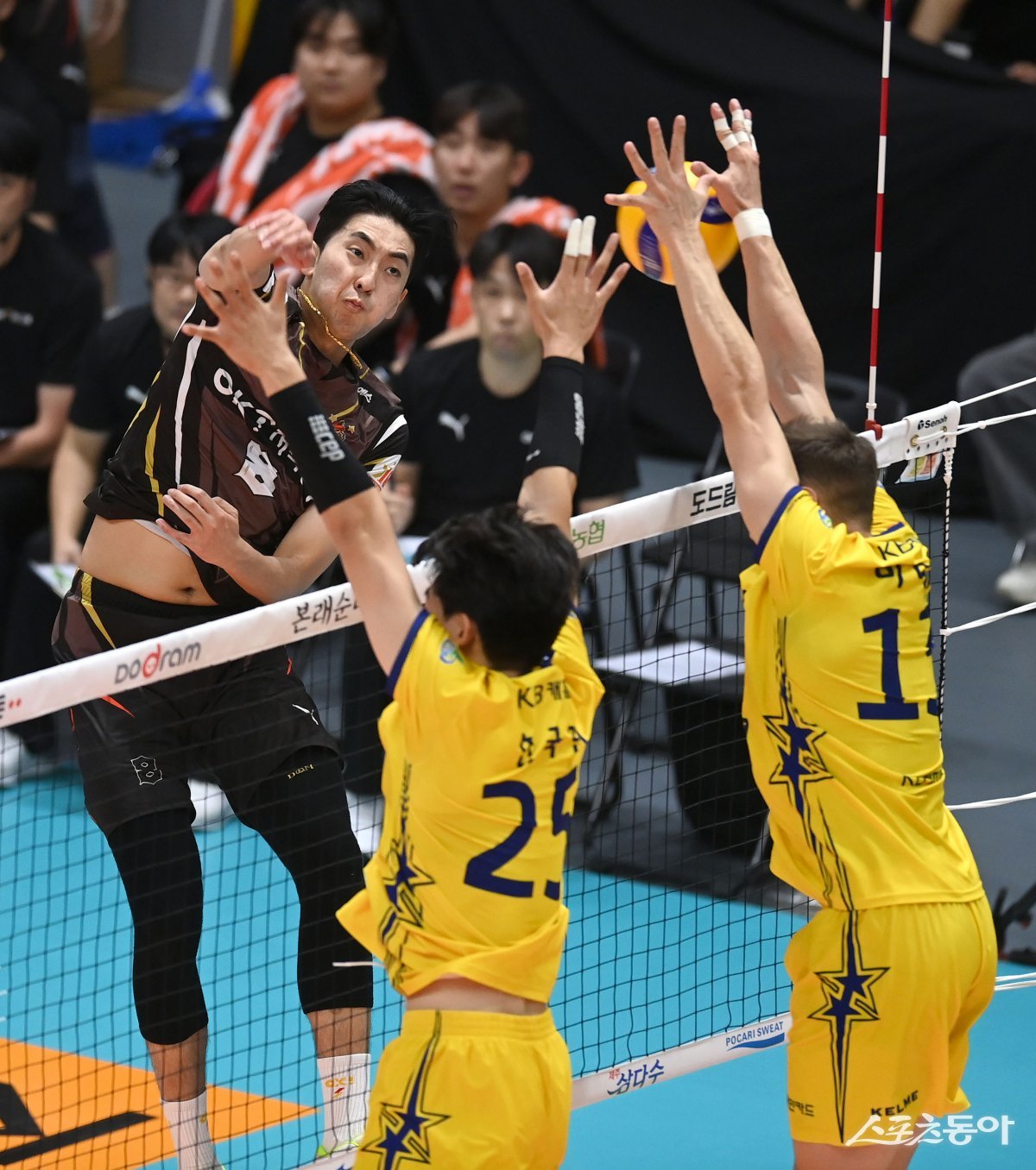24일 의정부체육관에서 열린 ‘도드람 2023~2024 V-리그’ 남자부 KB손해보험과 OK금융그룹 경기에서 OK금융그룹 차지환이 KB손해보험의 블로킹 사이로 스파이크를 날리고 있다.