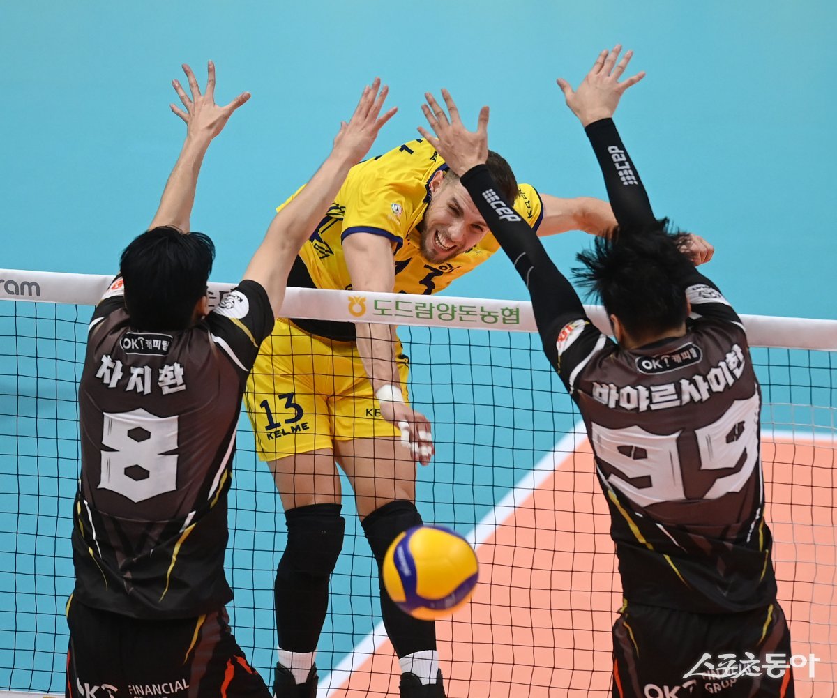 24일 의정부체육관에서 열린 ‘도드람 2023~2024 V-리그’ 남자부 KB손해보험과 OK금융그룹 경기에서 KB손해보험 비예나가 OK금융그룹의 블로킹 사이로 스파이크를 날리고 있다.