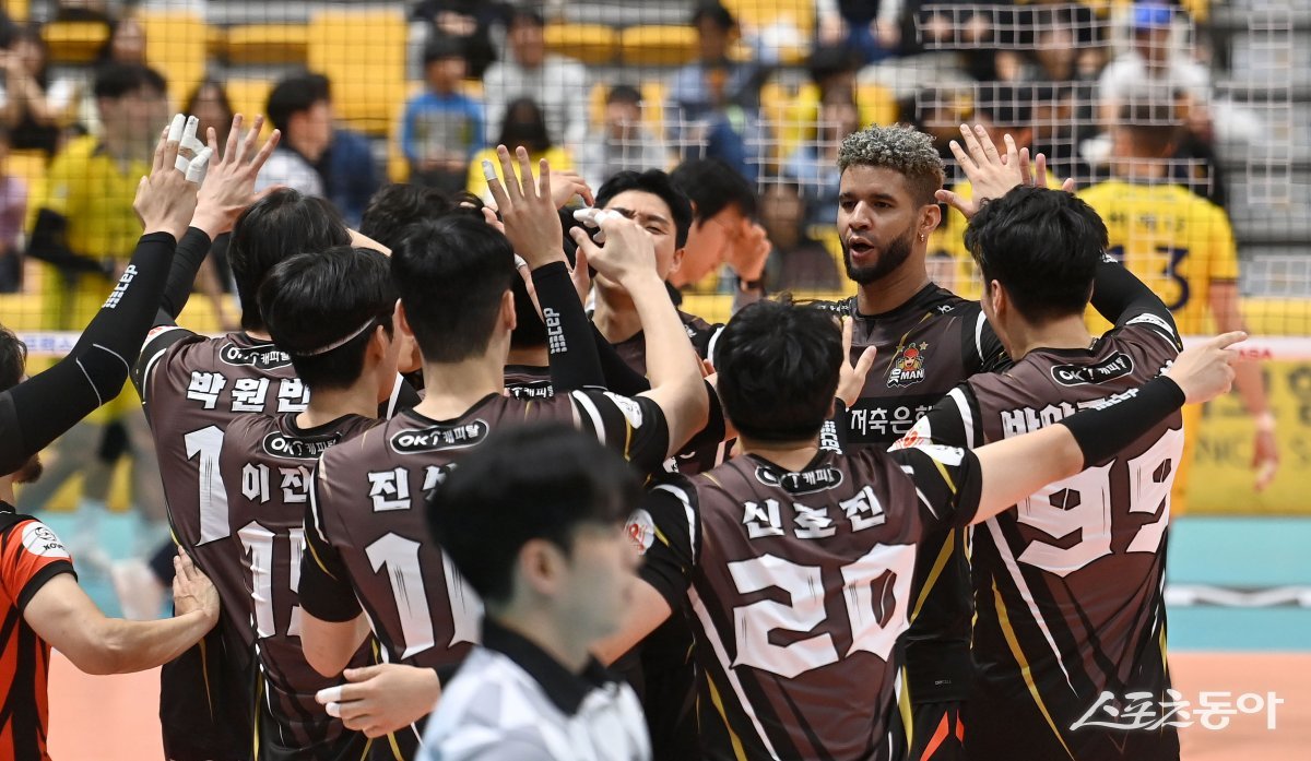 24일 의정부체육관에서 열린 ‘도드람 2023~2024 V-리그’ 남자부 KB손해보험과 OK금융그룹 경기에서 세트스코어 3-2 역전승을 거둔 OK금융그룹 레오가 기뻐하고 있다.