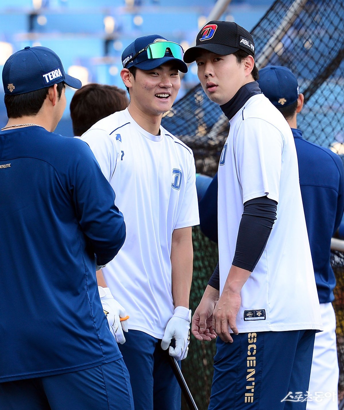 25일 창원NC파크에서 ‘2023 신한은행 SOL KBO리그’ NC 다이노스와 SSG 랜더스의 준PO 3차전 경기가 열린다. 경기 전 NC 김주원이 박건우와 이야기를 나누고 있다.