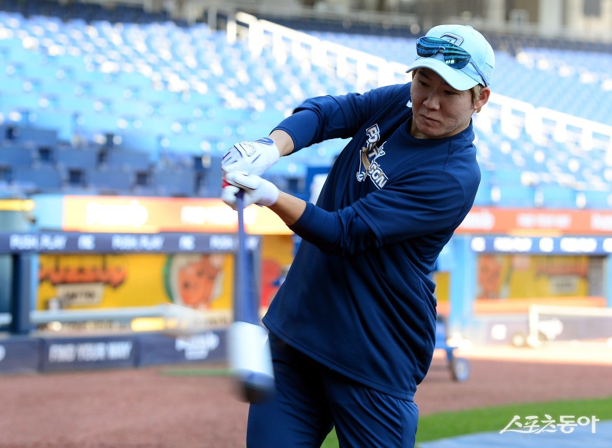 25일 창원NC파크에서 ‘2023 신한은행 SOL KBO리그’ NC 다이노스와 SSG 랜더스의 준PO 3차전 경기가 열린다. 경기 전 NC 박민우가 타격 훈련을 펼치고 있다.