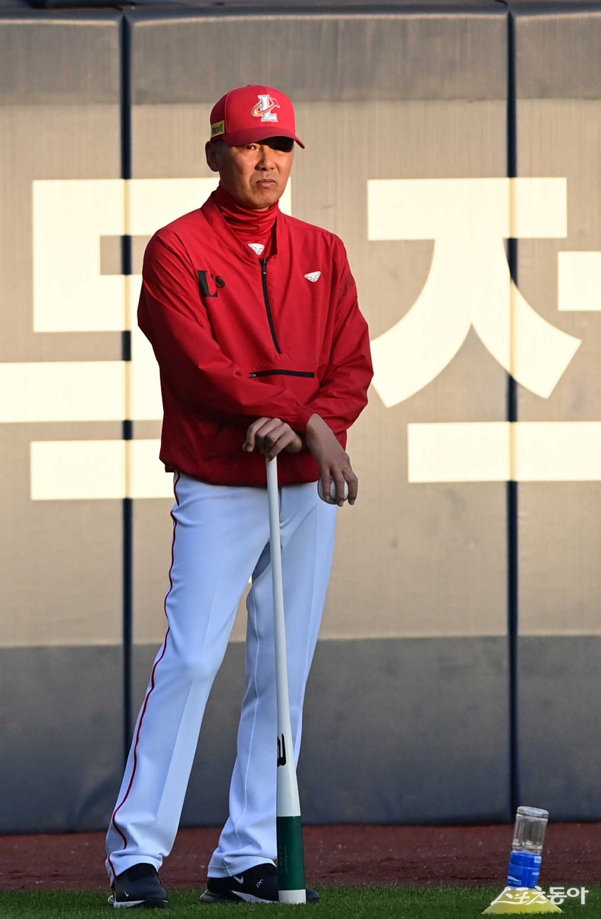 25일 창원NC파크에서 열린 ‘2023 KBO 포스트시즌’ NC 다이노스와 SSG 랜더스의 준플레이오프 3차전 경기에 앞서 SSG 김원형 감독이 선수들의 훈련을 지켜보고 있다.