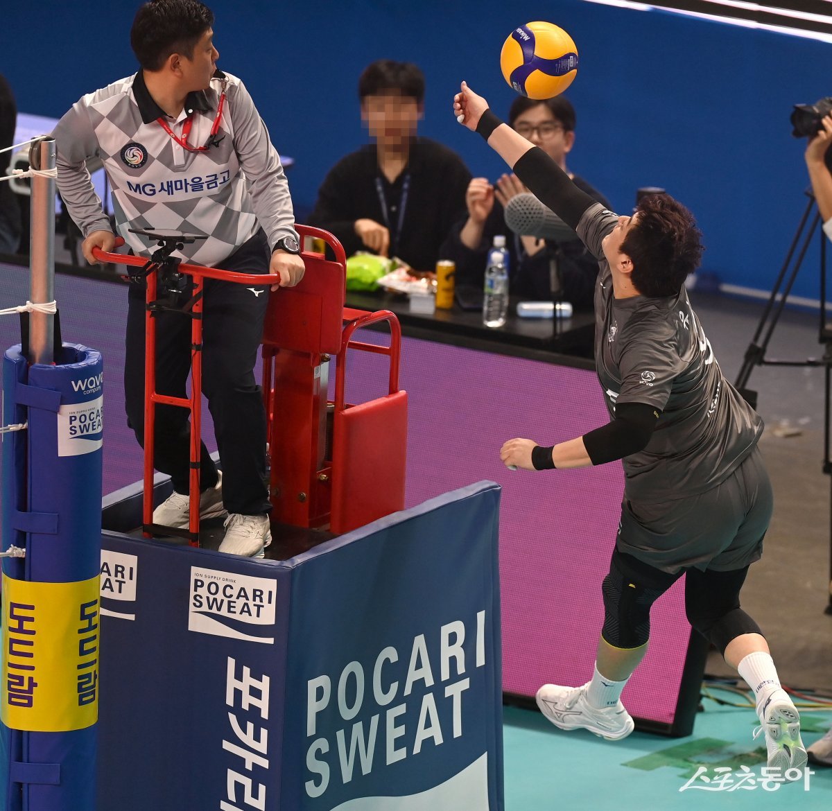 25일 서울 장충체육관에서 열린 ‘도드람 2023~2024 V-리그’ 남자부 우리카드와 대한항공 경기에서 대한항공 유광우가 코트 밖가지 달려가 디그를 하고 있다.