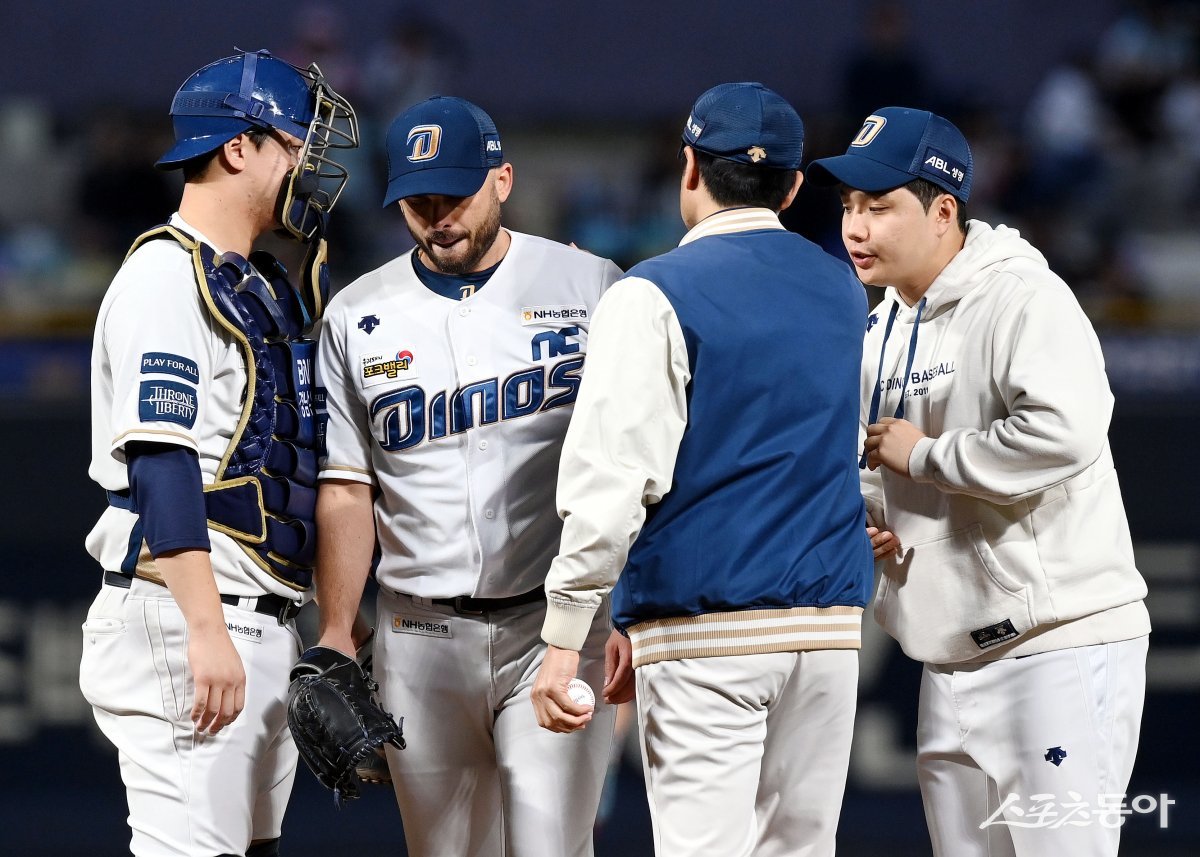 25일 창원NC파크에서 ‘2023 신한은행 SOL KBO리그’ NC 다이노스와 SSG 랜더스의 준PO 3차전 경기가 열렸다. 3회초 무사 1루에서 NC 선발 태너가 강판되고 있다.