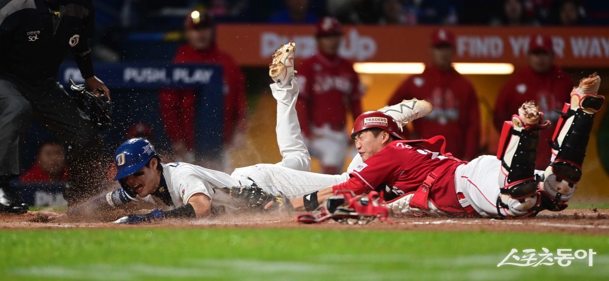 25일 창원NC파크에서 열린 ‘2023 KBO 포스트시즌’ NC 다이노스와 SSG 랜더스의 준플레이오프 3차전 경기에서 2회말 1사 1, 2루 NC의 좌전 적시타 때 2루주자 도태훈이 홈으로 파고들어 세이프 되고 있다.
