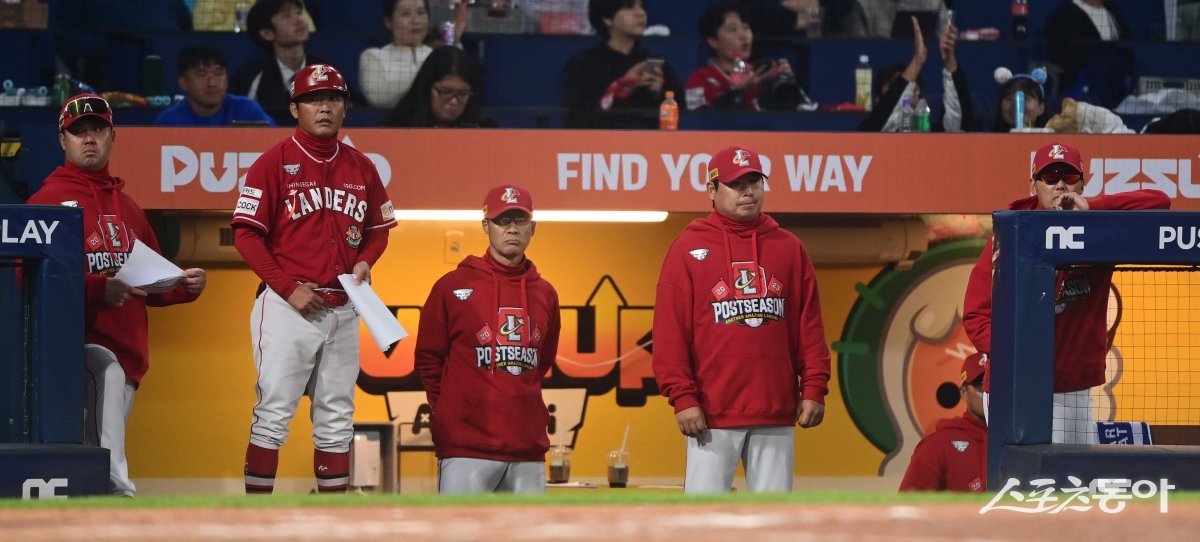 25일 창원NC파크에서 열린 ‘2023 KBO 포스트시즌’ NC 다이노스와 SSG 랜더스의 준플레이오프 3차전 경기에서 SSG 김원형 감독을 비롯한 코치들이 그라운드를 지켜보고 있다.