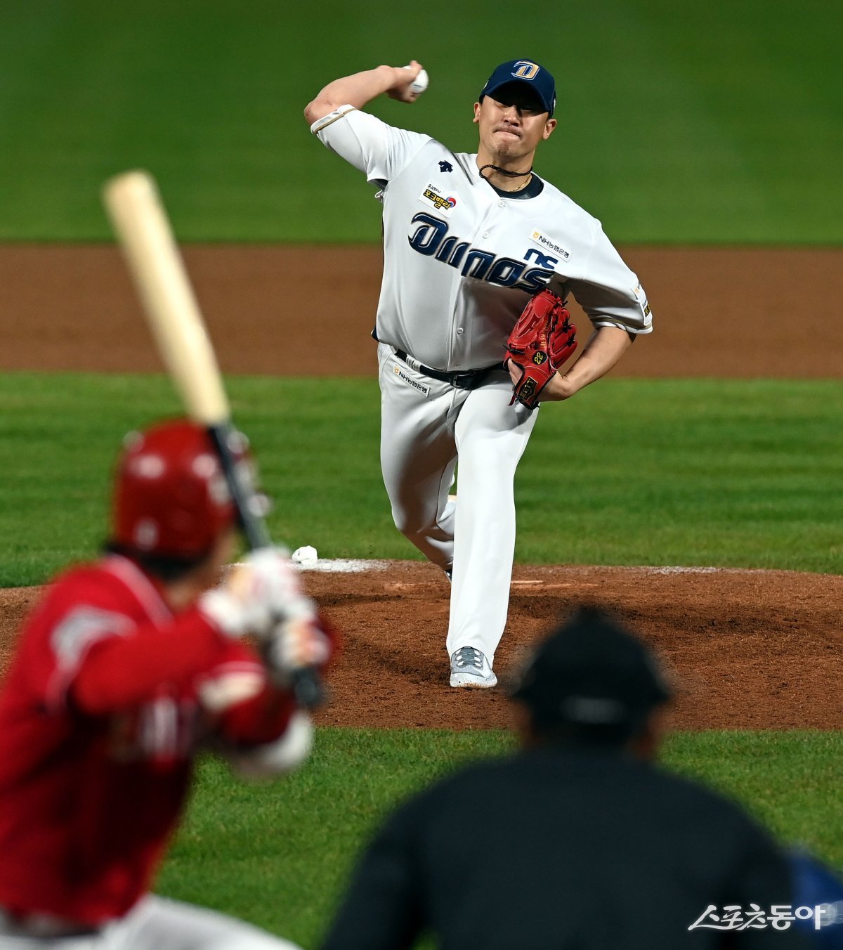 25일 창원NC파크에서 ‘2023 신한은행 SOL KBO리그’ NC 다이노스와 SSG 랜더스의 준PO 3차전 경기가 열렸다. 9회초 NC 마무리 이용찬이 힘차게 볼을 던지고 있다.