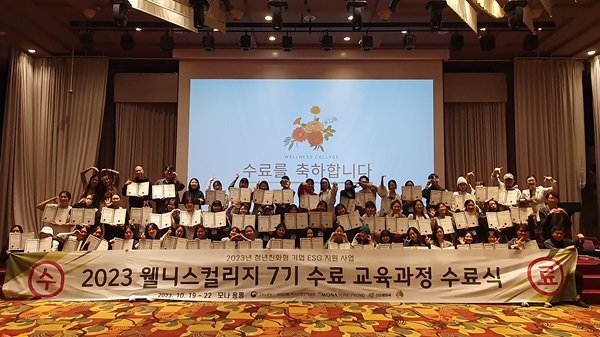 2022년도에 고용노동부 장관상을 수상한 바 있는 ‘웰니스 컬리지’는 최근 유망 산업으로 떠오르고 있는 웰니스와 마음챙김 분야의 전문가 양성교육 프로그램으로, 올해는 4기에서 7기까지 미취업 청년을 대상으로 4주간의 비대면 교육과 모나 용평에서 3박 4일간의 합숙 훈련으로 진행되었다.